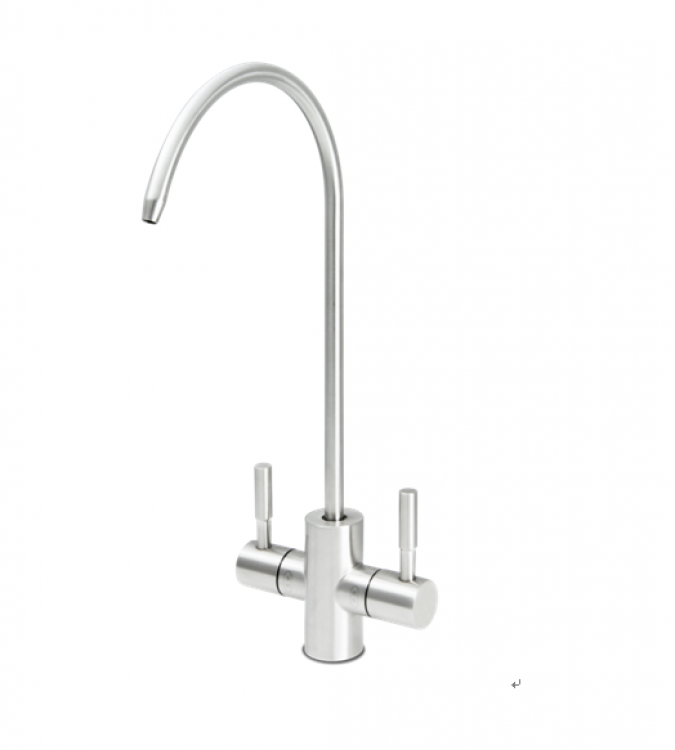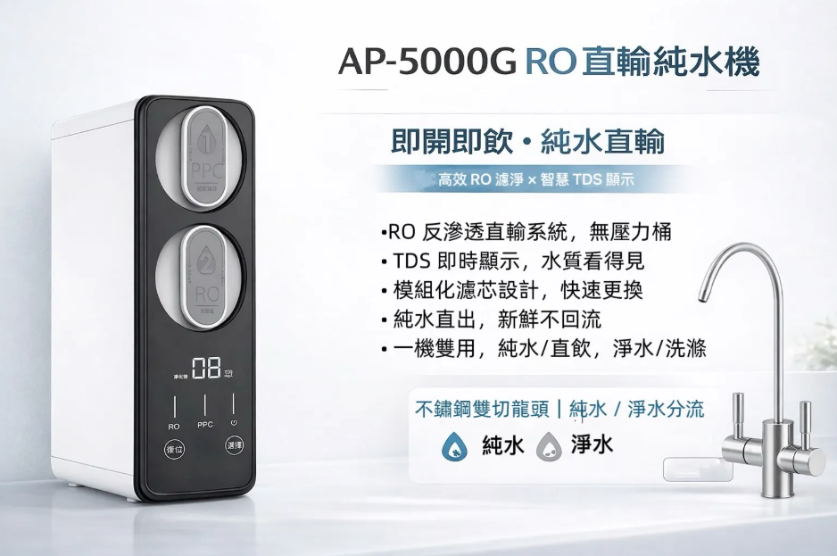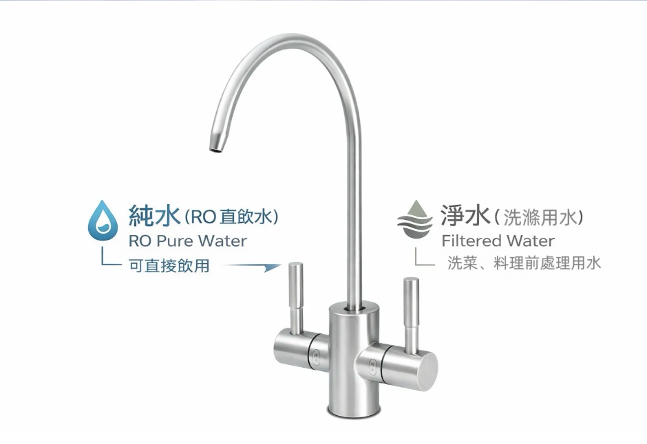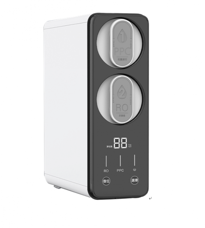 雙出水龍頭設計,純水直飲,淨水洗滌,一機雙用•前置 PPC 複合式濾芯:攔截泥沙、鐵鏽、餘氯• RO 膜濾芯:深層淨化水質• 快拆設計,濾芯更換簡單不費力